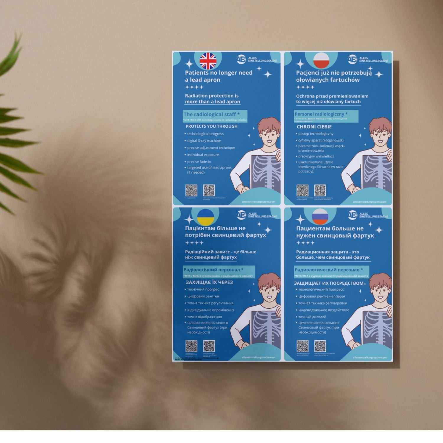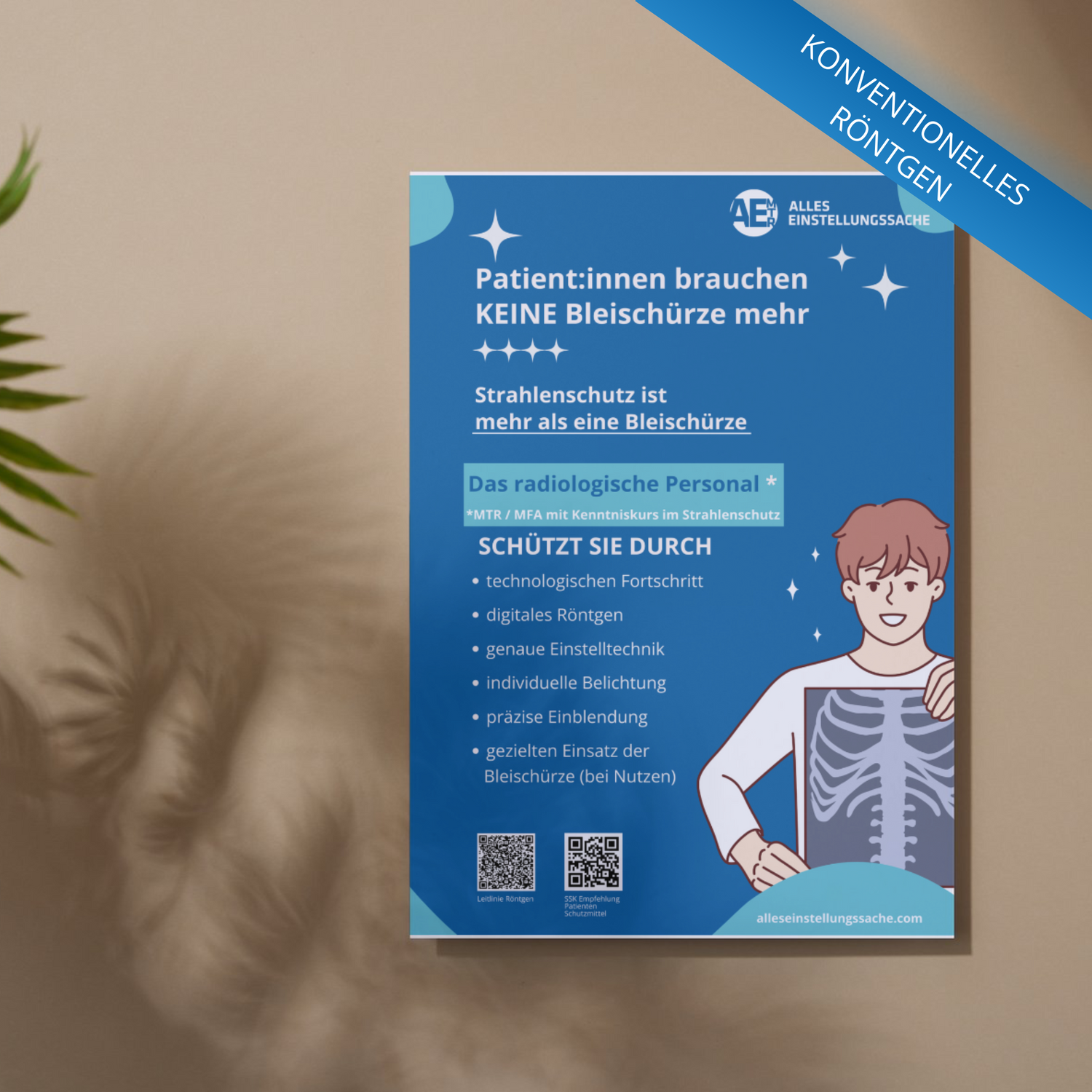 Unser informatives Poster "Bye Bye Bleischürze" erklärt anschaulich, warum in der modernen Radiologie auf Bleischürzen oft verzichtet wird. Mit einem ansprechenden Design und leicht verständlichen Texten bietet es wertvolle Aufklärung für Patienten und Patientinnen.