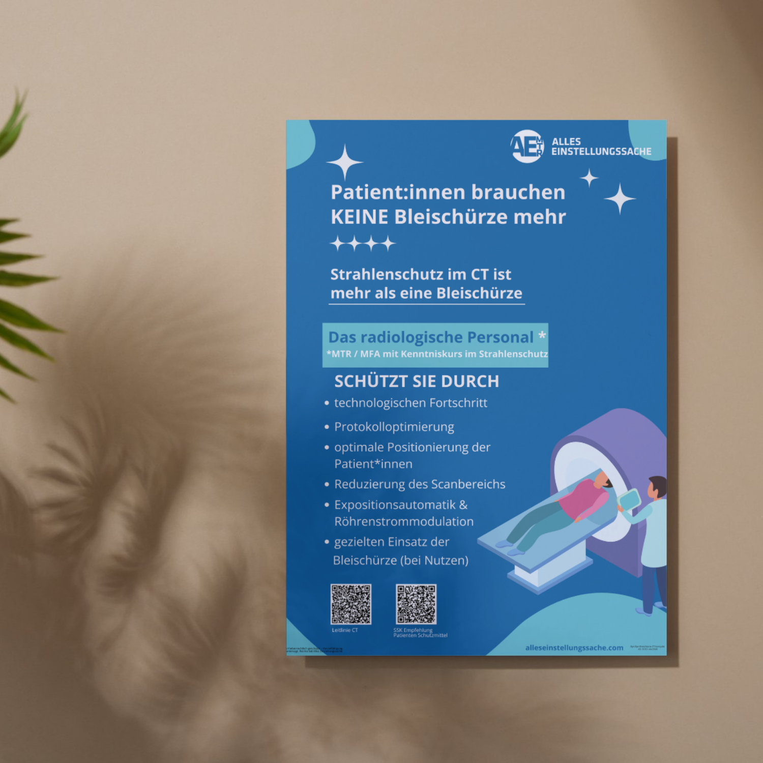 Das Poster Bye Bye Bleischürze CT informiert Ihre Patienten und Patientinnen über die Vorteile und Sicherheit moderner Röntgentechniken. Es erklärt leicht verständlich, warum die klassische Bleischürze heute oft überholt ist und welche Maßnahmen stattdessen für optimalen Schutz sorgen.
