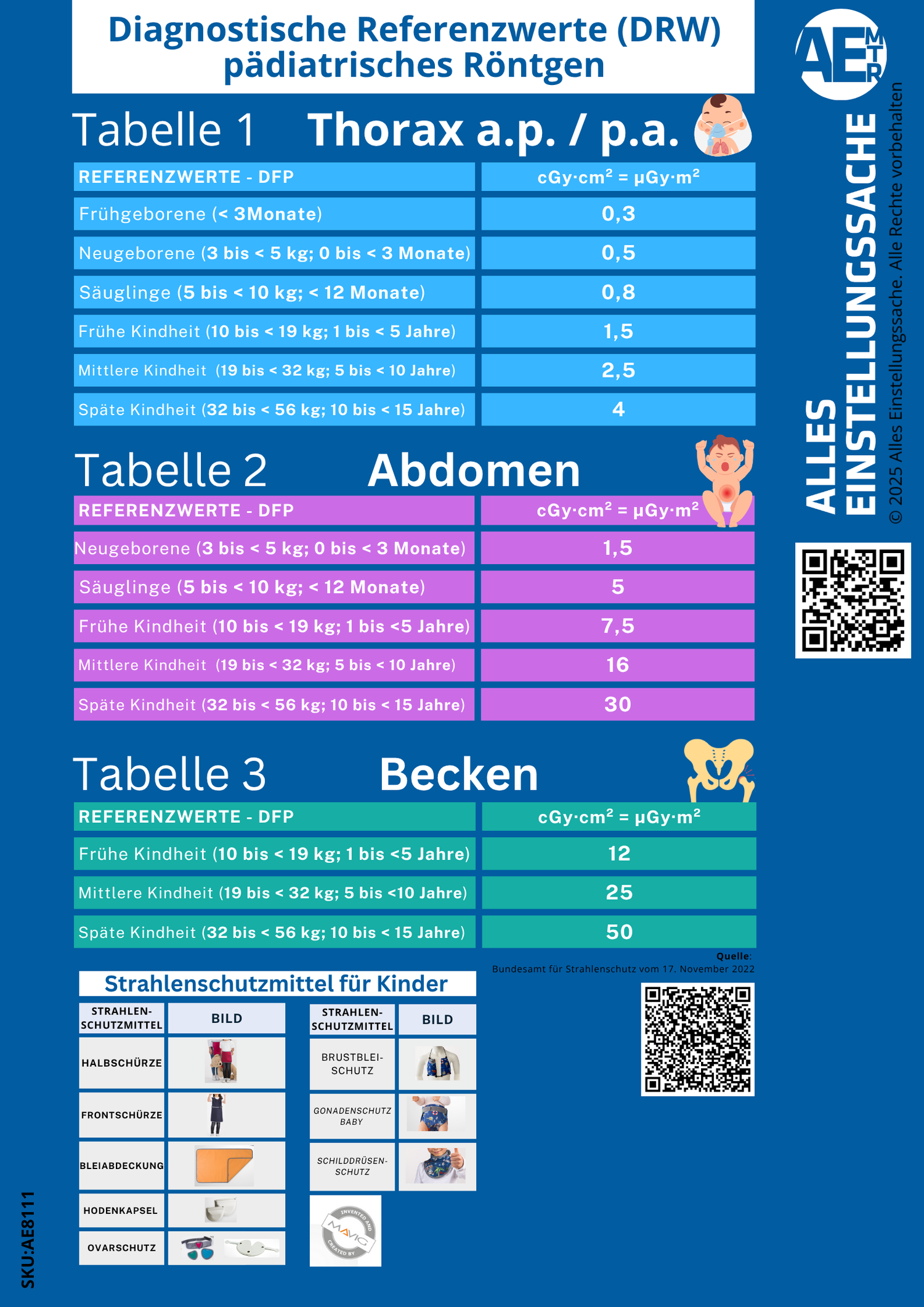 Die Tabelle basiert auf der aktuellen Leitlinie der Bundesärztekammer (22.12.2022) und den Diagnostischen Referenzwerten (DRW) in der Pädiatrie gemäß BfS (2023). Damit erfüllt sie die Anforderungen der Strahlenschutzverordnung (§ 124 StrlSchV) und unterstützt Radiologien dabei, gesetzliche Vorgaben sichtbar, nachvollziehbar und standardisiert umzusetzen.